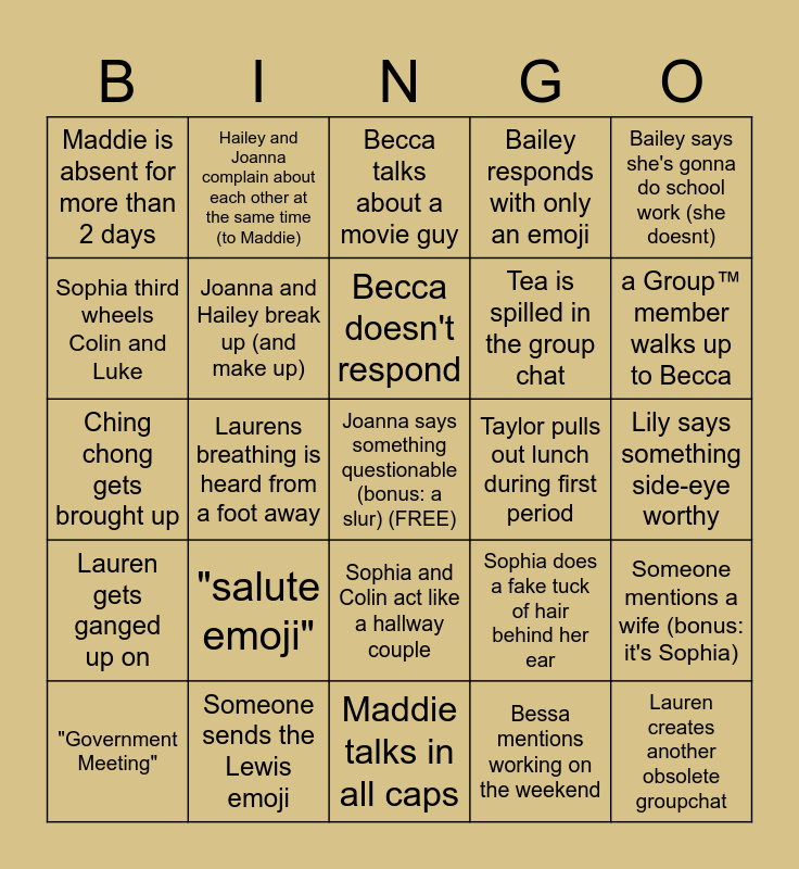 This bingo card has a free space and 41 words: Joanna talks about William, Ching chong gets brought up, Taylor zones out, Joanna and Hailey break up (and make up), Someone sends the Lewis emoji, Sophia and Colin act like a hallway couple, Becca doesn't respond, Joanna crashes out about the pledge, Bailey says she's gonna do school work (she doesnt), Lauren gets ganged up on, Laurens breathing is heard from a foot away, Bailey responds with only an emoji, Lauren creates another obsolete groupchat, Lily says something side-eye worthy, Taylor pulls out lunch during first period, "salute emoji", Sophia mentions George Washington, Maddie is absent for more than 2 days, Joanna says she's not gay, Becca talks about a movie guy, Someone mentions a wife (bonus: it's Sophia), The twins bring sushi, Maddie talks in all caps, Tea is spilled in the group chat, "Fish Brothers", Everyone runs from Lauren, Bessa mentions working on the weekend, Joanna calls Hailey a whore, a Group™ member walks up to Becca, Maddie leaves school at like 9, Bailey parks badly, Hailey and Joanna complain about each other at the same time (to Maddie), "Government Meeting", Joanna praises Trump, Sophia does a fake tuck of hair behind her ear, Sophia third wheels Colin and Luke, Taylor harcore crashes out about Elena, Joanna makes the quotebook, Becca's hair gets let down, Someone crashes out about Suyash and Bailey complains about IB art.