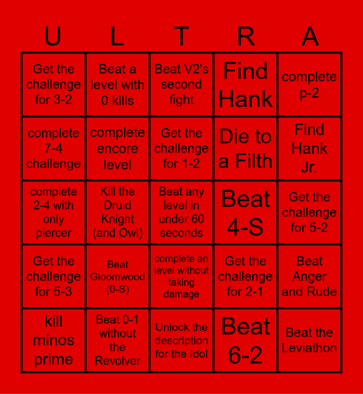 This bingo card has 35 words: Get P rank on 0-3, Get the challenge for 6-2, Beat Tundra and Agony, complete encore level, complete an level without taking damage, Find Hank, complete 7-4 challenge, Get to wave 8 in the Cyber Grind, Get the challenge for 1-2, Beat 1-S, complete 2-4 with only piercer, complete p-2, 100% 0-4, Beat Gabe's first fight, Get the challenge for 3-2, Beat 4-S, Beat 6-2, Kill the Druid Knight (and Owl), Get the challenge for 5-3, Beat any level in under 60 seconds, Get the challenge for 2-1, kill minos prime, Beat Anger and Rude, Beat 0-1 without the Revolver, Beat V2's second fight, Find Hank Jr., Beat the Leviathon, Unlock the Saw Launcher, Die to a Filth, Get the challenge for 5-2, Get on top of the lighthouse in 5-2, Unlock the description for the Idol, Beat Gloomwood (0-S), Beat a level with 0 kills and Die to something that is not an enemy.
