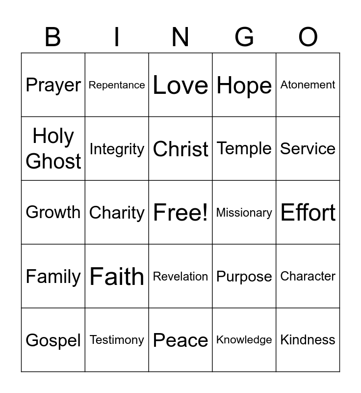 This bingo card has a free space and 24 words: Faith, Testimony, Christ, Gospel, Atonement, Prayer, Holy Ghost, Repentance, Missionary, Revelation, Temple, Growth, Purpose, Character, Integrity, Knowledge, Effort, Love, Service, Charity, Kindness, Family, Hope and Peace.