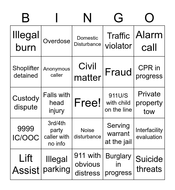 This bingo card has a free space and 34 words: S20 Caller, Burglary in progress, Structure Fire, Repo, 9999 IC/OOC, Anonymous caller, Alarm call, Lift Assist, Overdose, "This isn't an emergency but...", Civil matter, Domestic Disturbance, S3 with injuries, Language line, 911U/S with child on the line, CPR in progress, Illegal parking, Custody dispute, 3rd/4th party caller with no info, Serving warrant at the jail, Noise disturbance, Suspicious person, Illegal burn, Private property tow, 911 with obvious distress, Suicide threats, Traffic violator, Neighbor disturbance, Fraud, Shoplifter detained, Juvenile disturbance, Falls with head injury, Interfacility evaluation and Wires down.