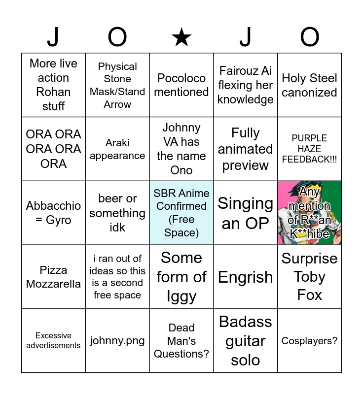 This bingo card has 1 images, a free space and 24 words: i ran out of ideas so this is a second free space, johnny.png, Johnny VA has the name Ono, Excessive advertisements, Holy Steel canonized, More live action Rohan stuff, ORA ORA ORA ORA ORA, Physical Stone Mask/Stand Arrow, Singing an OP, Some form of Iggy, Fully animated preview, Abbacchio = Gyro, Engrish, Surprise Toby Fox, Araki appearance, Badass guitar solo, Any mention of R**an K**hibe, Pocoloco mentioned, PURPLE HAZE FEEDBACK!!!, beer or something idk, Cosplayers?, Pizza Mozzarella, Fairouz Ai flexing her knowledge and Dead Man's Questions?.