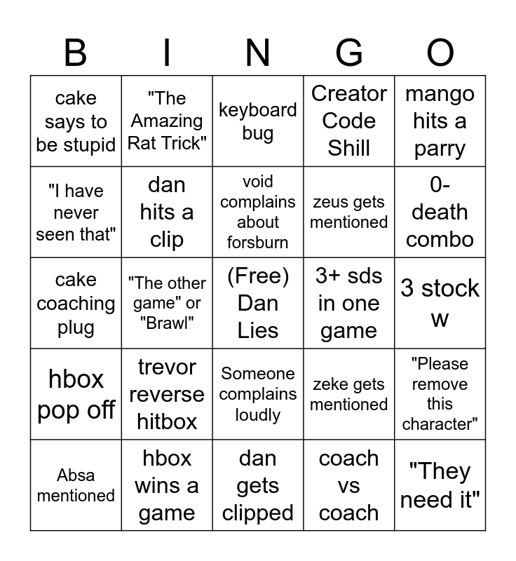 This bingo card has a free space and 26 words: Someone complains loudly, coach vs coach, void complains about forsburn, hbox wins a game, mango hits a parry, cake says to be stupid, "I have never seen that", "The Amazing Rat Trick", 3 stock w, zeke gets mentioned, zeus gets mentioned, cake coaching plug, "Please remove this character", Absa mentioned, "The other game" or "Brawl", "honest mid tier", Creator Code Shill, hbox pop off, keyboard bug, "They need it", 0-death combo, dan gets clipped, 3+ sds in one game, trevor reverse hitbox, dan hits a clip and shield break.