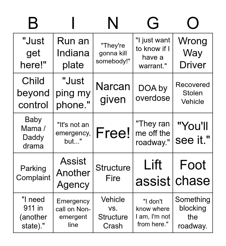 This bingo card has a free space and 30 words: Emergency call on Non-emergent line, Child Playing on the phone, "It's not an emergency, but...", Anonymous Caller, "Just get here!", "They're gonna kill somebody!", "Just ping my phone.", Structure Fire, "They ran me off the roadway.", Vehicle vs. Structure Crash, "You'll see it.", Something blocking the roadway., "I don't know where I am, I'm not from here.", Stolen Vehicle Report, Recovered Stolen Vehicle, Pedestrian down, Lift assist, Parking Complaint, Assist Another Agency, Wrong Way Driver, Baby Mama / Daddy drama, DUI Driver, Run an Indiana plate, DOA by overdose, Child beyond control, "I just want to know if I have a warrant.", Foot chase, "I need 911 in (another state).", Narcan given and Childbirth.