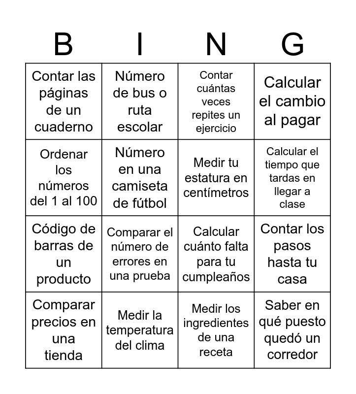 This bingo card has 31 words: Free!, Contar los estudiantes presentes, Contar los pasos hasta tu casa, Contar frutas en una canasta, Contar las páginas de un cuaderno, Contar cuántas veces repites un ejercicio, Medir tu estatura en centímetros, Medir el tiempo de una carrera, Medir la temperatura del clima, Medir cuánta agua cabe en una botella, Medir los ingredientes de una receta, Comparar precios en una tienda, Comparar la altura de dos personas, Comparar el puntaje en un juego, Comparar el número de errores en una prueba, Comparar la cantidad de comida en dos platos, Poner en orden de llegada a los estudiantes, Ordenar los libros por número de páginas, Saber en qué puesto quedó un corredor, Ordenar tareas por prioridad, Ordenar los números del 1 al 100, Leer una cédula o documento, Número del salón de clases, Número de bus o ruta escolar, Código de barras de un producto, Número en una camiseta de fútbol, Calcular el cambio al pagar, Calcular cuánto falta para tu cumpleaños, Calcular el total de una compra, Calcular el tiempo que tardas en llegar a clase and Calcular los puntos acumulados en una tarea.