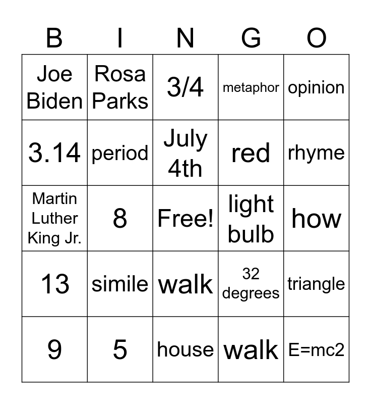 This bingo card has a free space and 31 words: house, George Washington, 8, question mark, Joe Biden, 3/4, period, 32 degrees, light bulb, walk, how, E=mc2, Arizona, persuasive, rhyme, 8373.7, triangle, simile, 13, walk, opinion, right angle, 9, Rosa Parks, red, 3.14, metaphor, Martin Luther King Jr., 5, July 4th and parenthisis, exponent, multiply, divide, add, subtract.