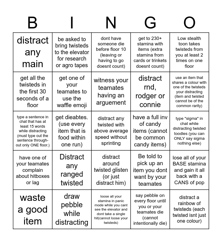 This bingo card has 25 words: Distract any ranged twisted, loose all your stamina in panic mode while you cant see the elevator and dont take a single hit(cannot loose your twisteds), witness your teamates having an arguement, waste a good item, Low stealth toon takes twisteds from you at least 2 times on one floor, distract any main, get all the twisteds in the first 30 seconds of a floor, be asked to bring twisteds to the elevator for research or agro tapes, have a full inv of candy items (cannot be common candy items), distract around twisted glisten (or just distract him), distract rnd, rodger or connie, type a sentence in chat that has at least 15 words while distracting (must type out the sentence through-out only ONE floor.), Be told to pick up an item you dont want by your teamates, lose all of your BASE stamina and gain it all back with a CANS of pop, get one of your teamates to use the waffle emoji, distract a rainbow of twisteds (each twisted isnt just one colour), type "sigma" in chat while distracting twisted toodles (you can ONLY say sigma nothing else), dont have someone die before floor 10 (leaving or having to go doesnt count), use an item that shares a colour with one of the twisteds your distracting (item and twisted cannot be of the common rarity), get dieabtes. (use every item that is food within one run), distract any twisted with above average speed without sprinting, draw pebble while distracting, have one of your teamates complain about hitboxes or lag, get to 230+ stamina with items (extra stamina from cards or trinkets doesnt count) and say pebble on every floor until you or your teamates die (cannot intentionally die).