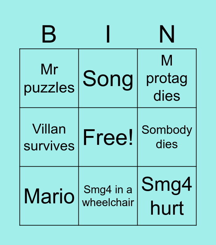 This bingo card has a free space and 8 words: Sombody dies, M protag dies, Song, Mario, Mr puzzles, Smg4 hurt, Villan survives and Smg4 in a wheelchair.