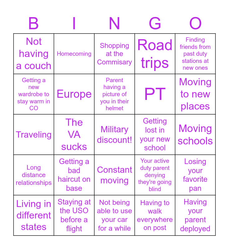 This bingo card has a free space and 44 words: Moving halfway through a school year, Having your parent deployed, Living overseas, Living in different states, Losing your things during a move, Having to walk everywhere on post, Shopping at the Commisary, Making new friends, Finding friends from past duty stations at new ones, Staying at the USO before a flight, Road trips, Getting lost in your new school, Constant moving, Getting a bad haircut on base, Learning a new language, Not being able to use your car for a while, Embracing being a dandelion, Traveling, Making a paper chain, Moving to new places, Homecoming, Free airplane rides, Packing up your entire house, Not having a couch, Both parents being in the military, Moving schools, Moving over Winter Break, Always being a new kid, Your active duty parent denying they're going blind, Long distance relationships, Losing friends, Losing your favorite pan, New stories, Getting held back, The VA sucks, GI Bill, Vietnam, Gun ranges, Parent having a picture of you in their helmet, Getting a new wardrobe to stay warm in CO, PT, Hawaii, Europe and "Thank you for your service".
