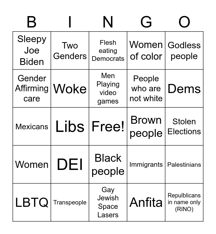 This bingo card has a free space and 24 words: DEI, Transpeople, Men Playing video games, LBTQ, Godless people, Sleepy Joe Biden, Gender Affirming care, Two Genders, Brown people, Black people, People who are not white, Mexicans, Immigrants, Palestinians, Woke, Anfita, Stolen Elections, Flesh eating Democrats, Dems, Libs, Repulblicans in name only (RINO), Women, Women of color and Gay Jewish Space Lasers.