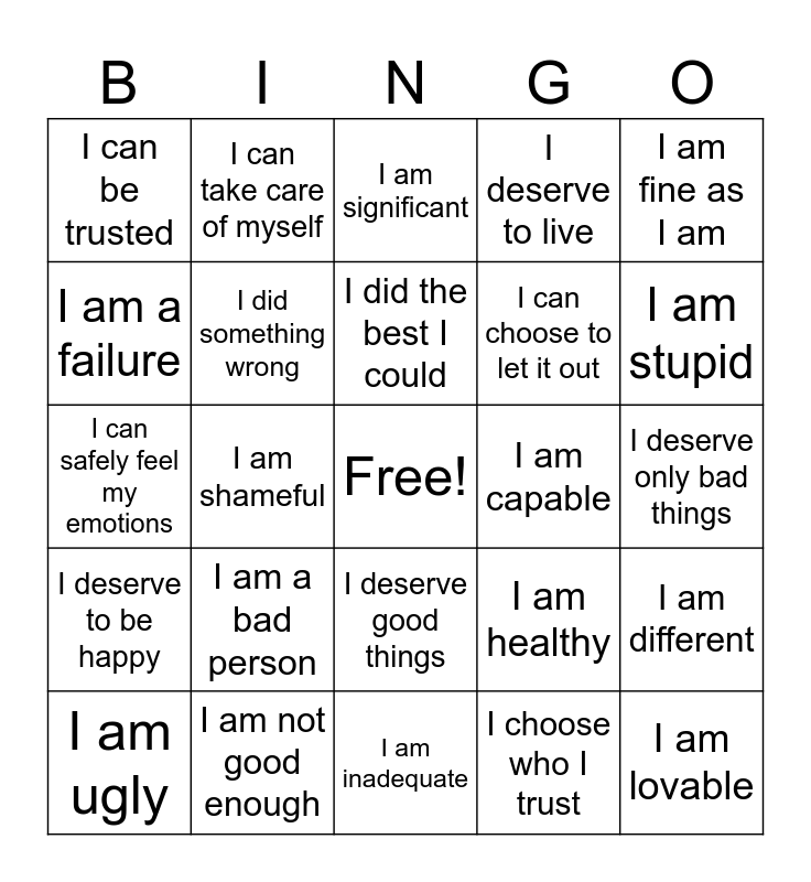This bingo card has a free space and 24 words: I am a bad person, I am not good enough, I did the best I could, I am ugly, I am fine as I am, I can be trusted, I am a failure, I can take care of myself, I am capable, I deserve good things, I can choose to let it out, I can safely feel my emotions, I am healthy, I am different, I did something wrong, I choose who I trust, I deserve only bad things, I am significant, I am stupid, I am shameful, I am lovable, I deserve to be happy, I deserve to live and I am inadequate.