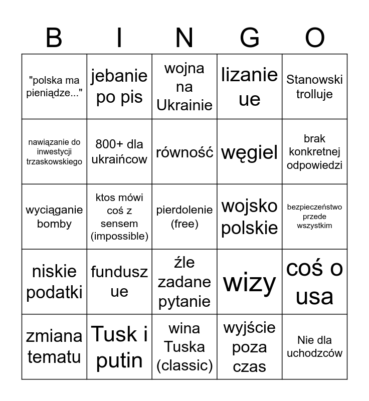 This bingo card has a free space and 24 words: fundusz ue, Tusk i putin, równość, zmiana tematu, Stanowski trolluje, "polska ma pieniądze...", nawiązanie do inwestycji trzaskowskiego, jebanie po pis, wojsko polskie, źle zadane pytanie, węgiel, wyciąganie bomby, wizy, coś o usa, 800+ dla ukraińcow, wyjście poza czas, bezpieczeństwo przede wszystkim, wojna na Ukrainie, brak konkretnej odpowiedzi, ktos mówi coś z sensem (impossible), Nie dla uchodzców, niskie podatki, lizanie ue and wina Tuska (classic).