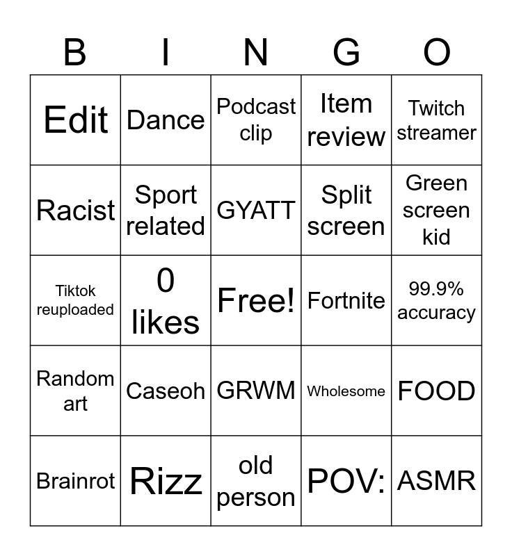 This bingo card has a free space and 24 words: Caseoh, Rizz, GYATT, Brainrot, Twitch streamer, Edit, Racist, Dance, Fortnite, GRWM, Split screen, Tiktok reuploaded, Wholesome, FOOD, Sport related, POV:, 99.9% accuracy, Podcast clip, Green screen kid, 0 likes, ASMR, Random art, Item review and old person.