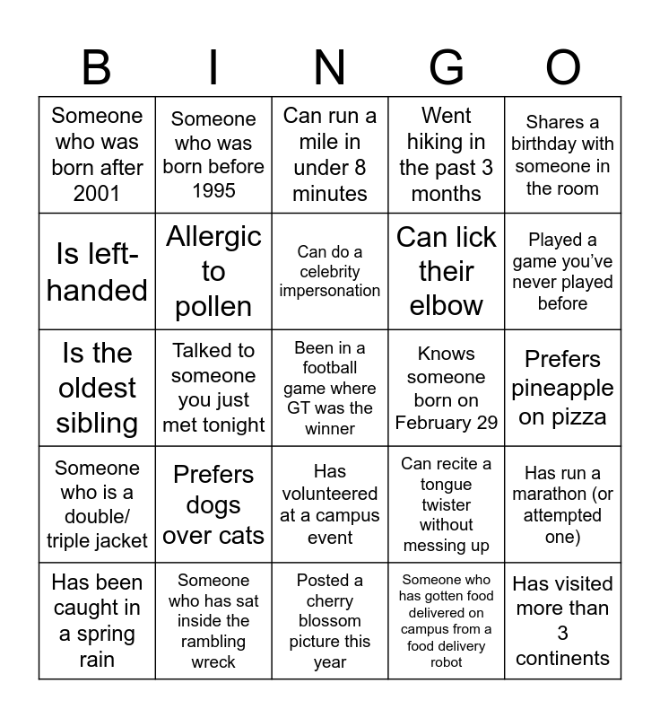 This bingo card has 25 words: Someone who is a double/ triple jacket, Someone who has sat inside the rambling wreck, Been in a football game where GT was the winner, Someone who has gotten food delivered on campus from a food delivery robot, Shares a birthday with someone in the room, Someone who was born after 2001, Someone who was born before 1995, Can run a mile in under 8 minutes, Knows someone born on February 29, Has run a marathon (or attempted one), Is left-handed, Allergic to pollen, Posted a cherry blossom picture this year, Can recite a tongue twister without messing up, Played a game you’ve never played before, Has been caught in a spring rain, Talked to someone you just met tonight, Can do a celebrity impersonation, Can lick their elbow, Prefers pineapple on pizza, Is the oldest sibling, Prefers dogs over cats, Has volunteered at a campus event, Went hiking in the past 3 months and Has visited more than 3 continents.