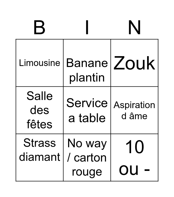 This bingo card has a free space and 8 words: Aspiration d âme, Zouk, Banane plantin, Strass diamant, Limousine, 10 ou -, Salle des fêtes and No way / carton rouge.