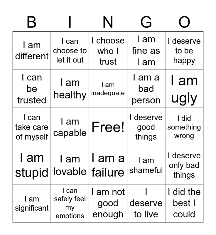This bingo card has a free space and 24 words: I am lovable, I can safely feel my emotions, I am inadequate, I am significant, I deserve to be happy, I am different, I can be trusted, I can choose to let it out, I deserve good things, I am a failure, I am a bad person, I can take care of myself, I am shameful, I deserve only bad things, I am healthy, I deserve to live, I did something wrong, I choose who I trust, I am ugly, I am capable, I did the best I could, I am stupid, I am fine as I am and I am not good enough.