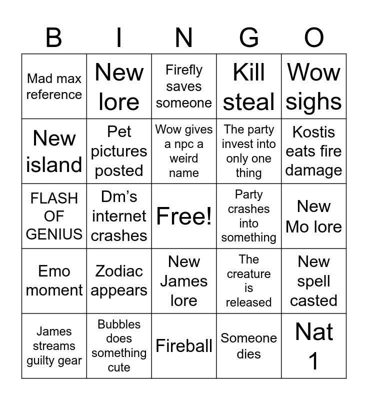 This bingo card has a free space and 49 words: Nat 20, Nat 1, The party spends way too much money, Fireball, Zodiac appears, New trauma unlocked, New lore, Healing is casted, New island, Someone comes back from the dead, Pet pictures posted, Kill steal, New spell casted, The creature is released, Aqua mention, Death roll, Wow gives a npc a weird name, Party crashes into something, New mechanics, Wow sighs, Dm’s internet crashes, Someone dies, Mad max reference, The party invest into only one thing, Lume Cameo, Kostis eats fire damage, James streams guilty gear, Kostis being the only sane one, New James lore, Emo moment, SMITE SNEAK CRIT, Xeris does something cool, New girlfriend unlocked, New Denise lore, Bubbles does something cute, Buttercup kills a man, Vivi talks about his family, Buttercup talks about her family, New Mo lore, Umberlee Warns the party, Buff vivi moment, Buttercup friends someone, SENDING!!!, New Lex lore, FLASH OF GENIUS, Firefly saves someone, Cas does something smart, Cas mom time and New meira lore.