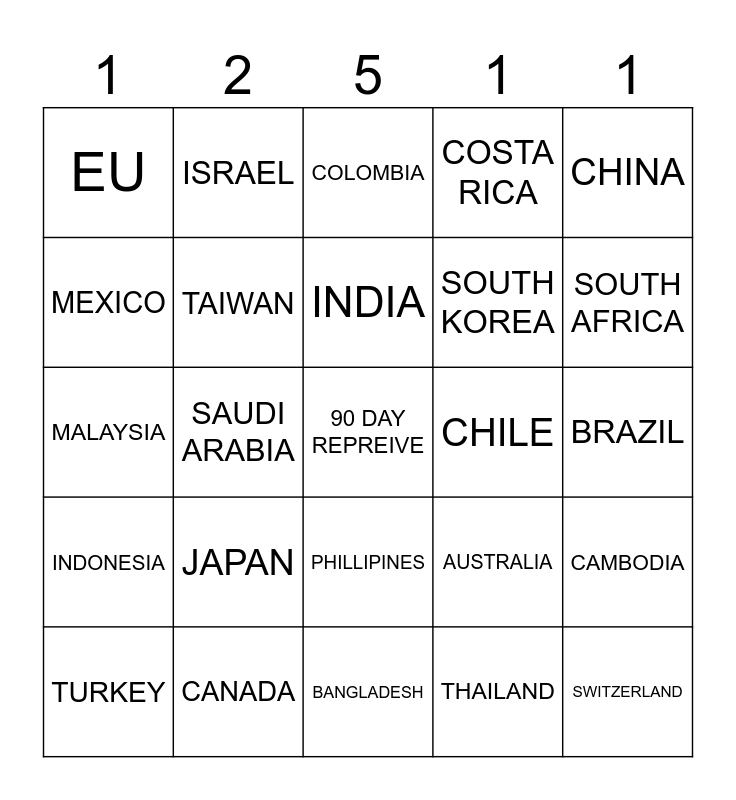 This bingo card has a free space and 24 words: JAPAN, CANADA, INDIA, TURKEY, CHINA, EU, MEXICO, ISRAEL, CHILE, PHILLIPINES, SOUTH KOREA, MALAYSIA, AUSTRALIA, CAMBODIA, TAIWAN, THAILAND, BRAZIL, COLOMBIA, SOUTH AFRICA, SAUDI ARABIA, SWITZERLAND, INDONESIA, COSTA RICA and BANGLADESH.