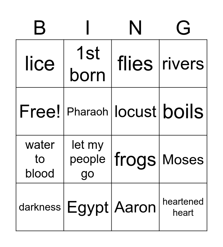 This bingo card has 16 words: Egypt, Moses, flies, lice, water to blood, 1st born, frogs, Aaron, Free!, Pharaoh, darkness, rivers, let my people go, boils, locust and heartened heart.