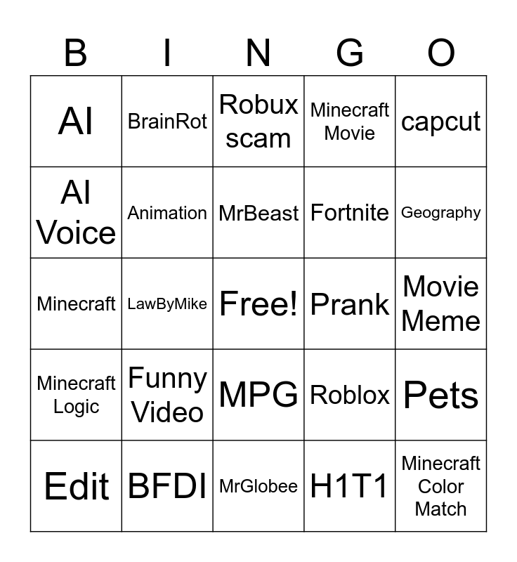 This bingo card has a free space and 24 words: Funny Video, BFDI, MrBeast, Edit, capcut, AI, AI Voice, BrainRot, Prank, MPG, Fortnite, Minecraft, Roblox, Pets, Animation, H1T1, Movie Meme, Robux scam, Geography, LawByMike, Minecraft Color Match, Minecraft Logic, Minecraft Movie and MrGlobee.