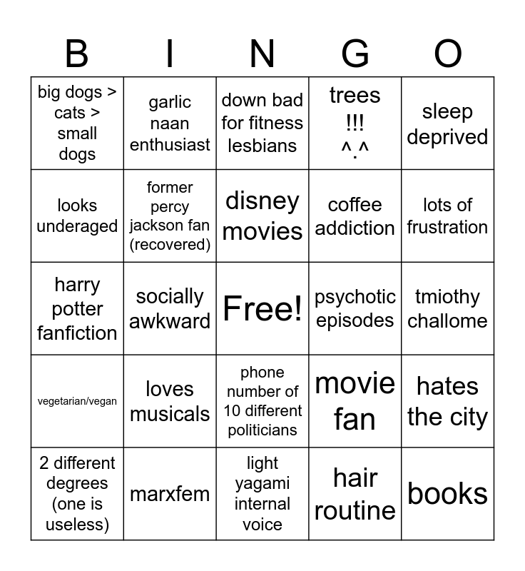 This bingo card has a free space and 24 words: loves musicals, marxfem, disney movies, 2 different degrees (one is useless), sleep deprived, big dogs > cats > small dogs, looks underaged, garlic naan enthusiast, psychotic episodes, phone number of 10 different politicians, coffee addiction, harry potter fanfiction, movie fan, hates the city, former percy jackson fan (recovered), hair routine, tmiothy challome, down bad for fitness lesbians, lots of frustration, socially awkward, books, vegetarian/vegan, trees !!! ^.^ and light yagami internal voice.