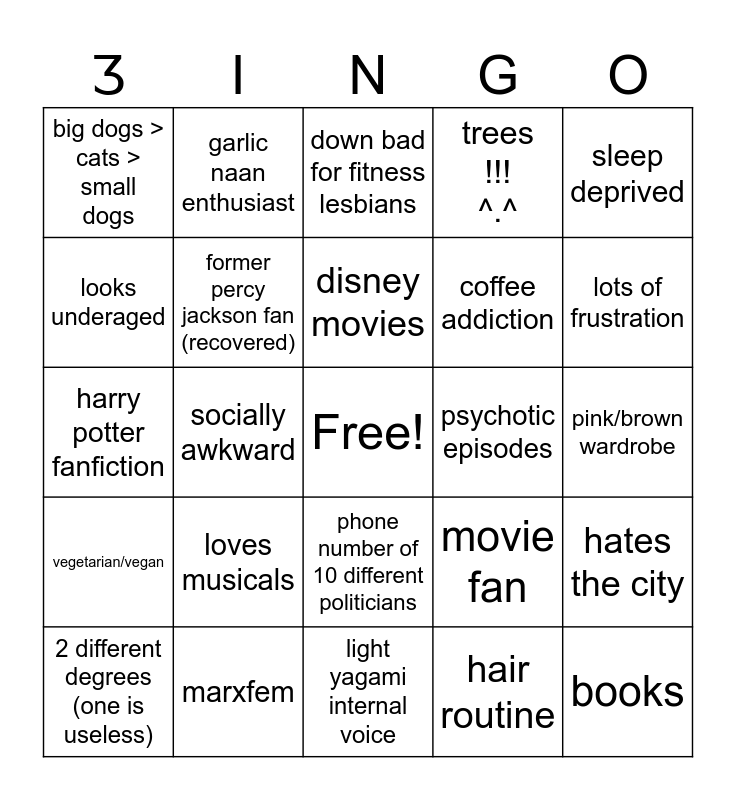 This bingo card has a free space and 24 words: loves musicals, marxfem, disney movies, 2 different degrees (one is useless), sleep deprived, big dogs > cats > small dogs, looks underaged, garlic naan enthusiast, psychotic episodes, phone number of 10 different politicians, coffee addiction, harry potter fanfiction, movie fan, hates the city, former percy jackson fan (recovered), hair routine, pink/brown wardrobe, down bad for fitness lesbians, lots of frustration, socially awkward, books, vegetarian/vegan, trees !!! ^.^ and light yagami internal voice.
