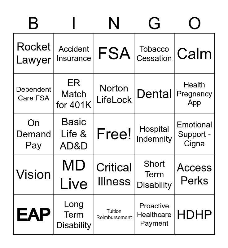 This bingo card has a free space and 25 words: MD Live, Tuition Reimbursement, Norton LifeLock, EAP, Calm, Rocket Lawyer, Dependent Care FSA, Accident Insurance, Hospital Indemnity, Critical Illness, Dental, On Demand Pay, Short Term Disability, Access Perks, ER Match for 401K, HSA, Emotional Support - Cigna, FSA, Health Pregnancy App, Basic Life & AD&D, HDHP, Long Term Disability, Vision, Tobacco Cessation and Proactive Healthcare Payment.