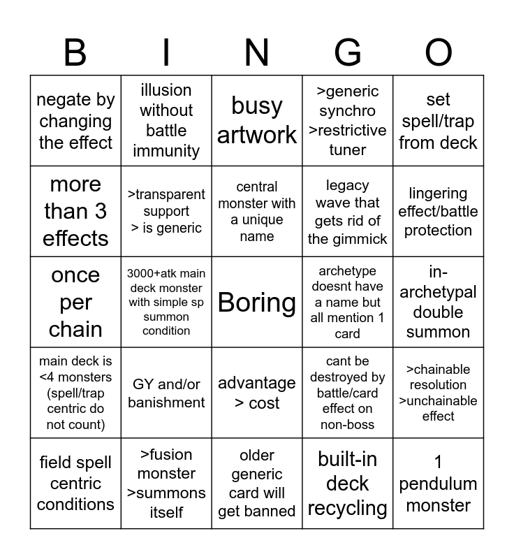 This bingo card has a free space and 24 words: GY and/or banishment, >fusion monster >summons itself, central monster with a unique name, field spell centric conditions, set spell/trap from deck, negate by changing the effect, more than 3 effects, illusion without battle immunity, archetype doesnt have a name but all mention 1 card, advantage > cost, legacy wave that gets rid of the gimmick, once per chain, cant be destroyed by battle/card effect on non-boss, >chainable resolution >unchainable effect, >transparent support > is generic, built-in deck recycling, in-archetypal double summon, busy artwork, lingering effect/battle protection, 3000+atk main deck monster with simple sp summon condition, 1 pendulum monster, main deck is <4 monsters (spell/trap centric do not count), >generic synchro >restrictive tuner and older generic card will get banned.