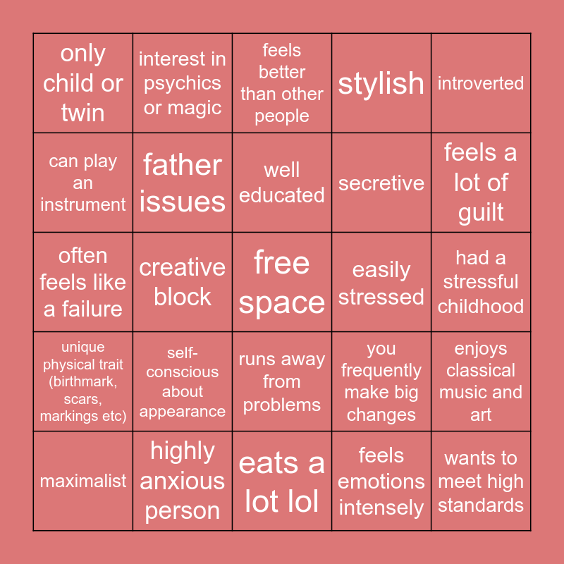 This bingo card has a free space and 24 words: self-conscious about appearance, highly anxious person, well educated, maximalist, introverted, only child or twin, can play an instrument, interest in psychics or magic, easily stressed, runs away from problems, secretive, often feels like a failure, you frequently make big changes, enjoys classical music and art, father issues, feels emotions intensely, had a stressful childhood, feels better than other people, feels a lot of guilt, creative block, wants to meet high standards, unique physical trait (birthmark, scars, markings etc), stylish and eats a lot lol.