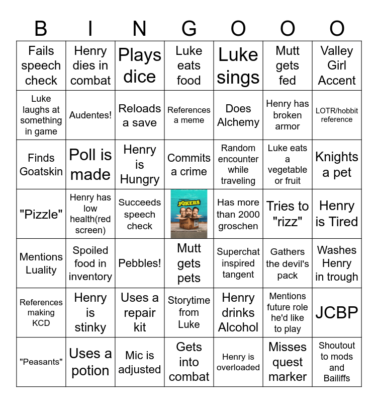This bingo card has a free space and 48 words: Henry drinks Alcohol, Henry has broken armor, Gets into combat, Henry has low health(red screen), Henry is Hungry, Henry is Tired, Henry dies in combat, Uses a potion, Mutt gets fed, Mutt gets pets, Valley Girl Accent, Luke eats food, Luke eats a vegetable or fruit, Random encounter while traveling, References making KCD, Tries to "rizz", Luke laughs at something in game, LOTR/hobbit reference, Mentions future role he'd like to play, Luke sings, Does Alchemy, Succeeds speech check, Fails speech check, Audentes!, JCBP, Reloads a save, Knights a pet, "Peasants", Commits a crime, Poll is made, Misses quest marker, Has more than 2000 groschen, Washes Henry in trough, Henry is stinky, "Pizzle", Superchat inspired tangent, Gathers the devil's pack, Finds Goatskin, Pebbles!, Uses a repair kit, Mentions Luality, Shoutout to mods and Bailiffs, Plays dice, Mic is adjusted, References a meme, Storytime from Luke, Spoiled food in inventory and Henry is overloaded.