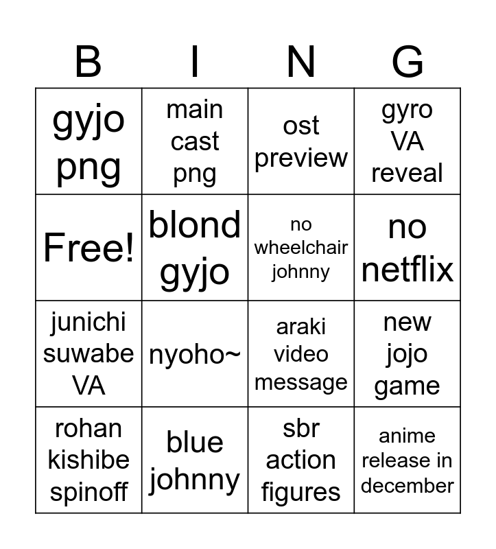 This bingo card has 16 words: blue johnny, new jojo game, ost preview, gyjo png, junichi suwabe VA, main cast png, araki video message, sbr action figures, Free!, blond gyjo, rohan kishibe spinoff, gyro VA reveal, nyoho~, no netflix, no wheelchair johnny and anime release in december.