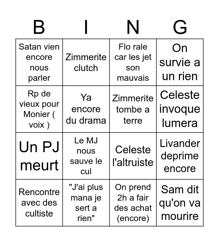 This bingo card has 16 words: "J'ai plus mana je sert a rien", Livander deprime encore, Flo rale car les jet son mauvais, Satan vien encore nous parler, Un PJ meurt, Zimmerite clutch, Celeste l'altruiste, On prend 2h a fair des achat (encore), Rp de vieux pour Monier ( voix ), Ya encore du drama, Rencontre avec des cultiste, On survie a un rien, Le MJ nous sauve le cul, Celeste invoque lumera, Zimmerite tombe a terre and Sam dit qu'on va mourire.