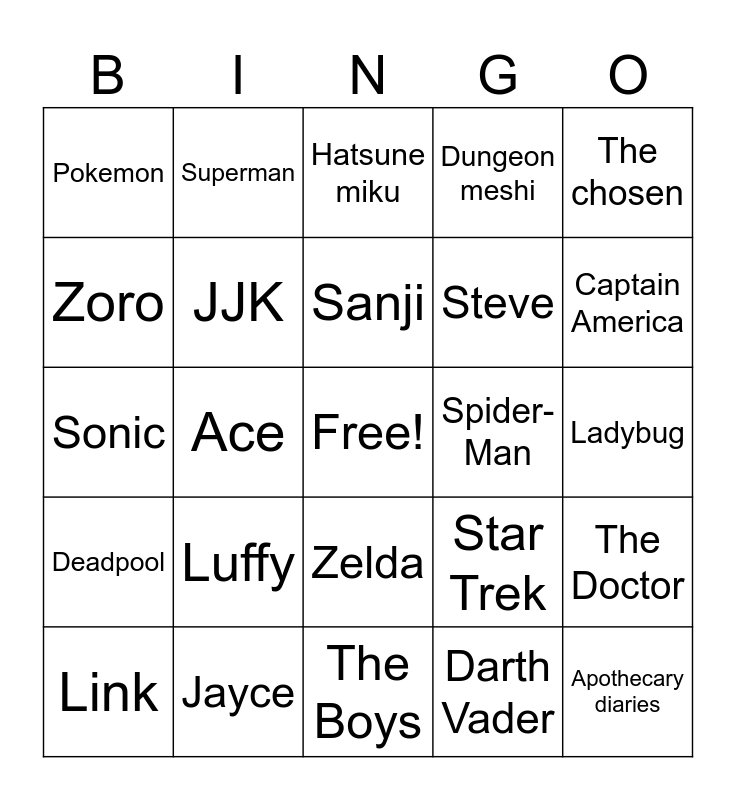 This bingo card has a free space and 24 words: Luffy, Jayce, Sanji, Link, The chosen, Pokemon, Zoro, Superman, Spider-Man, Zelda, Steve, Sonic, Star Trek, The Doctor, JJK, Darth Vader, Ladybug, Hatsune miku, Captain America, Ace, Apothecary diaries, Deadpool, Dungeon meshi and The Boys.