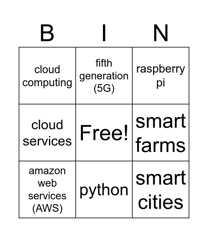 This bingo card has a free space and 12 words: hardware, latency, smart cities, smart farms, fifth generation (5G), raspberry pi, python, PAN (Personal Area Network), cloud computing, cloud services, amazon web services (AWS) and LoRa WAN.