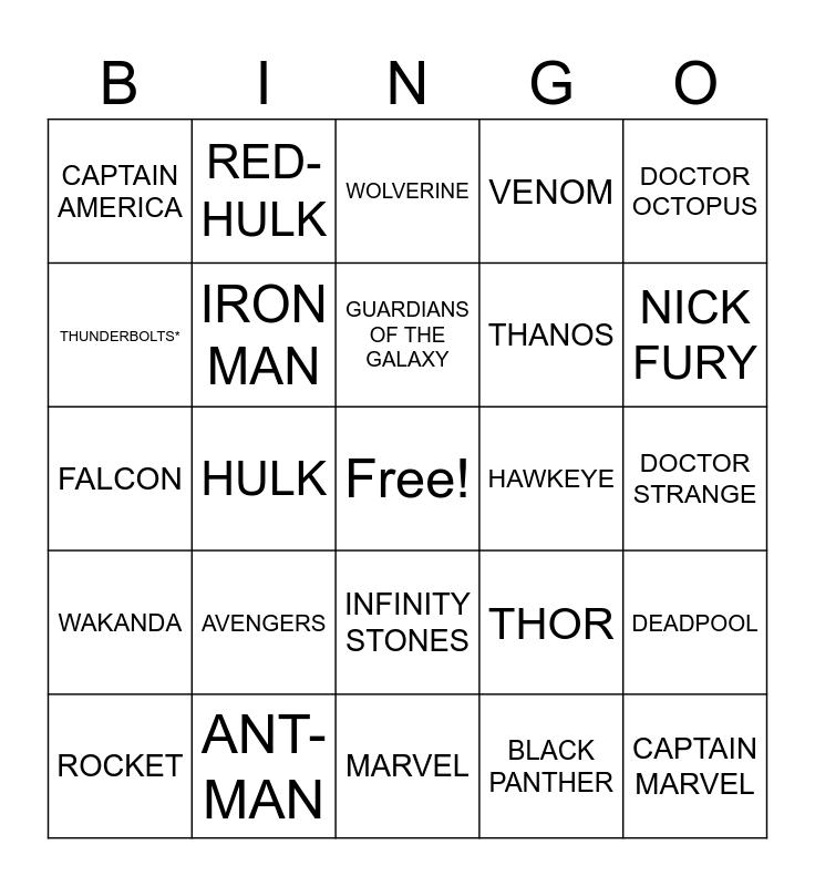 This bingo card has a free space and 31 words: MARVEL, HYDRA, HULK, SPIDER-MAN, CAPTAIN AMERICA, WOLVERINE, IRON MAN, THOR, HAWKEYE, BLACK PANTHER, DOCTOR STRANGE, CAPTAIN MARVEL, VISION, BLACK WIDOW, NICK FURY, WINTER SOLDIER, DEADPOOL, AVENGERS, WAKANDA, INFINITY STONES, DOCTOR OCTOPUS, GROOT, ROCKET, RED-HULK, THANOS, THUNDERBOLTS*, VENOM, FALCON, ANT-MAN, GUARDIANS OF THE GALAXY and STAR LORD.
