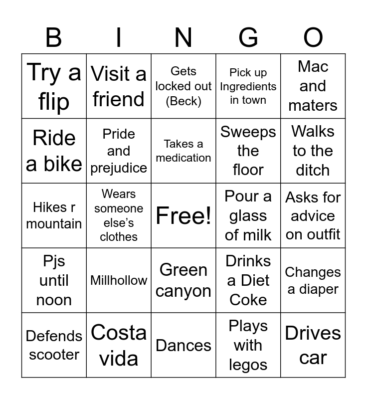 This bingo card has a free space and 24 words: Millhollow, Costa vida, Takes a medication, Defends scooter, Mac and maters, Try a flip, Ride a bike, Visit a friend, Pour a glass of milk, Green canyon, Sweeps the floor, Hikes r mountain, Drinks a Diet Coke, Changes a diaper, Pride and prejudice, Plays with legos, Asks for advice on outfit, Gets locked out (Beck), Walks to the ditch, Wears someone else’s clothes, Drives car, Pjs until noon, Pick up Ingredients in town and Dances.