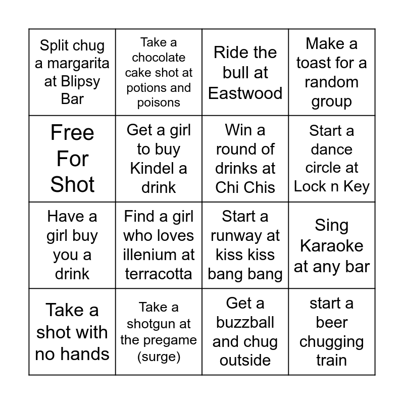 This bingo card has 16 words: Take a shotgun at the pregame (surge), Sing Karaoke at any bar, Ride the bull at Eastwood, Split chug a margarita at Blipsy Bar, Have a girl buy you a drink, Take a chocolate cake shot at potions and poisons, Start a runway at kiss kiss bang bang, Get a buzzball and chug outside, Free For Shot, Get a girl to buy Kindel a drink, Take a shot with no hands, Make a toast for a random group, Find a girl who loves illenium at terracotta, Start a dance circle at Lock n Key, Win a round of drinks at Chi Chis and start a beer chugging train.