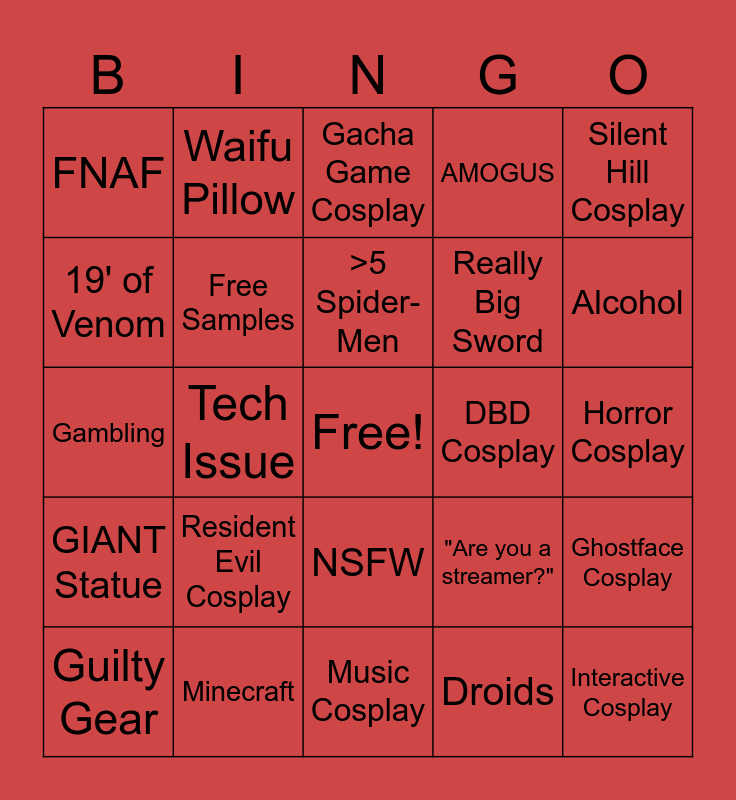 This bingo card has a free space and 24 words: Resident Evil Cosplay, Minecraft, >5 Spider-Men, Guilty Gear, Silent Hill Cosplay, FNAF, 19' of Venom, Waifu Pillow, DBD Cosplay, NSFW, Really Big Sword, Gambling, "Are you a streamer?", Ghostface Cosplay, Free Samples, Droids, Horror Cosplay, Gacha Game Cosplay, Alcohol, Tech Issue, Interactive Cosplay, GIANT Statue, AMOGUS and Music Cosplay.