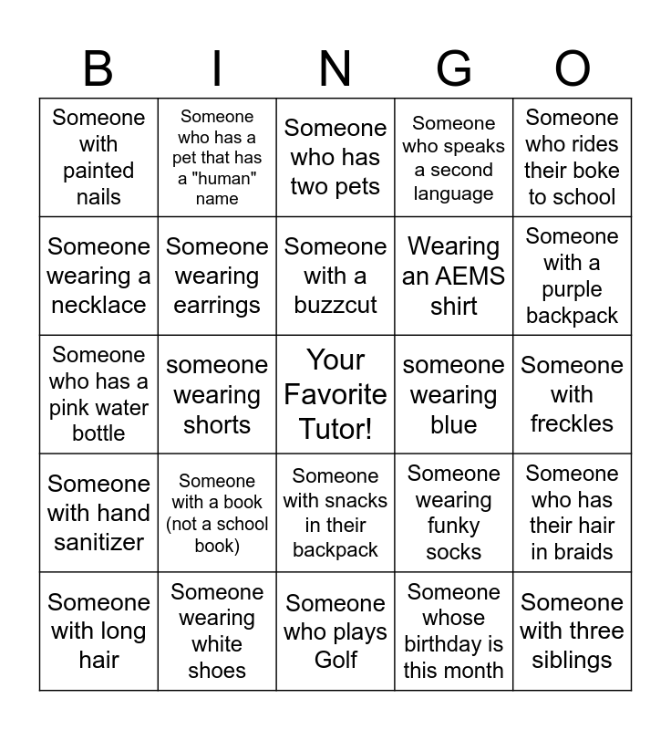 This bingo card has a free space and 29 words: Someone with long hair, Someone with glasses, someone wearing shorts, Someone wearing a sports team logo, Someone with painted nails, Someone who has two pets, Someone wearing earrings, Someone with a book (not a school book), someone wearing blue, Someone wearing white shoes, Someone with freckles, Someone with three siblings, Someone who plays Golf, Someone whose birthday is this month, Someone with a purple backpack, Someone with an android phone, Someone with snacks in their backpack, Someone with hand sanitizer, Someone who rides their boke to school, Someone who has a pink water bottle, Someone wearing funky socks, Wearing stripes, Wearing an AEMS shirt, Someone wearing a necklace, Someone who speaks a second language, Someone who has a pet that has a "human" name, Someone who has their hair in braids, Someone with a buzzcut and Someone with red shoe laces.