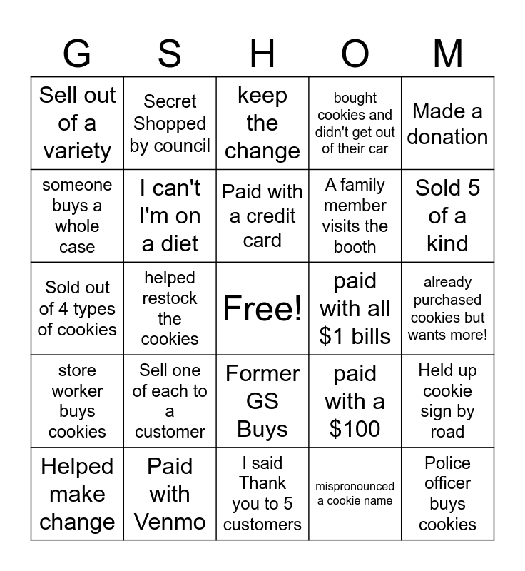 This bingo card has a free space and 26 words: Former GS Buys, mispronounced a cookie name, Paid with a credit card, Paid with Venmo, Made a donation, Sell out of a variety, someone buys a whole case, Secret Shopped by council, already purchased cookies but wants more!, paid with a $100, A family member visits the booth, Sold out of 4 types of cookies, Held up cookie sign by road, Helped make change, helped restock the cookies, current girl scout bought cookies, bought cookies and didn't get out of their car, store worker buys cookies, keep the change, Police officer buys cookies, Sold 5 of a kind, I said Thank you to 5 customers, paid with all $1 bills, Sell one of each to a customer, I can't I'm on a diet and car honks.