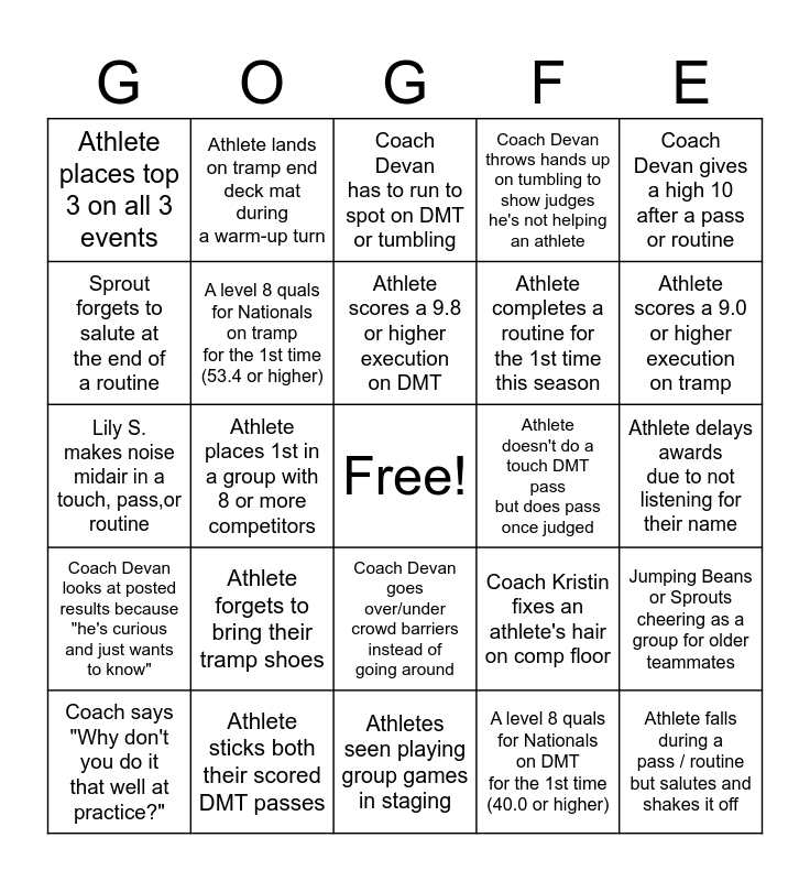 This bingo card has a free space and 24 words: Athlete forgets to bring their tramp shoes, Athlete sticks both their scored DMT passes, Athlete scores a 9.8 or higher execution on DMT, Coach says "Why don't you do it that well at practice?", Coach Devan gives a high 10 after a pass or routine, Athlete places top 3 on all 3 events, Sprout forgets to salute at the end of a routine, Athlete lands on tramp end deck mat during a warm-up turn, Athlete doesn't do a touch DMT pass but does pass once judged, Coach Devan goes over/under crowd barriers instead of going around, Athlete completes a routine for the 1st time this season, Lily S. makes noise midair in a touch, pass,or routine, Coach Kristin fixes an athlete's hair on comp floor, Jumping Beans or Sprouts cheering as a group for older teammates, A level 8 quals for Nationals on tramp for the 1st time (53.4 or higher), A level 8 quals for Nationals on DMT for the 1st time (40.0 or higher), Athlete delays awards due to not listening for their name, Coach Devan has to run to spot on DMT or tumbling, Athlete scores a 9.0 or higher execution on tramp, Athlete places 1st in a group with 8 or more competitors, Athlete falls during a pass / routine but salutes and shakes it off, Coach Devan looks at posted results because "he's curious and just wants to know", Coach Devan throws hands up on tumbling to show judges he's not helping an athlete and Athletes seen playing group games in staging.