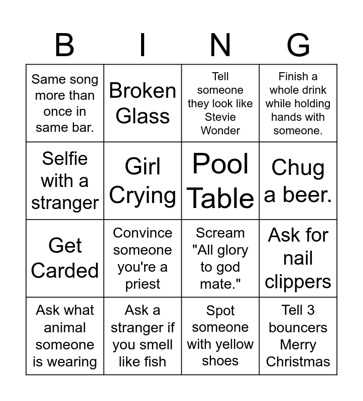 This bingo card has 20 words: Ask for nail clippers, Spot a mullet, Tell someone they look like Stevie Wonder, Take a glass from the bar., Ask what animal someone is wearing, Selfie with a stranger, Ask a stranger if you smell like fish, Same song more than once in same bar., Get Carded, Broken Glass, Convince someone you're a priest, Scream "All glory to god mate.", Girl Crying, Tell 3 bouncers Merry Christmas, Pool Table, See someone fall, Chug a beer., Finish a whole drink while holding hands with someone., Spot someone with yellow shoes and Vegas bomb.
