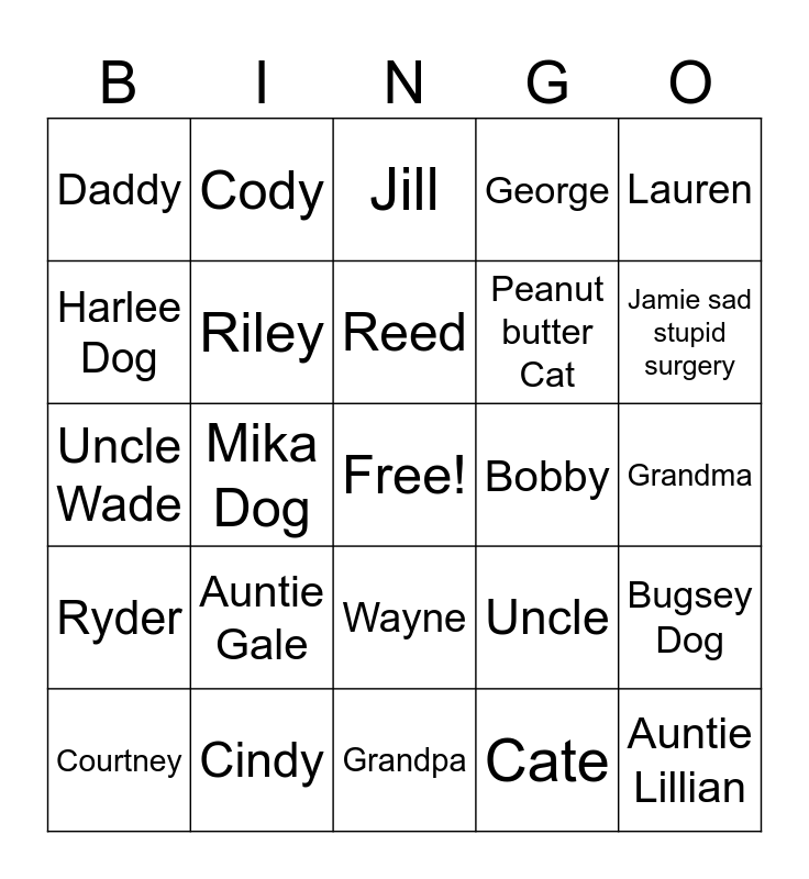 This bingo card has a free space and 34 words: Allie, Cate, Kenny, Kylana, Ryder, Riley, Lauren, Courtney, Cody, Tracyn, Reed, Jill, Josten, Chelsea Don’t like me drink soda, Bobby, Jamie sad stupid surgery, Cindy, Uncle Wade, Auntie Gale, Uncle, Wayne, Mommy, Daddy, Grandma, Grandpa, Auntie Lillian, George, Daisy Dog, Peanut butter Cat, Harlee Dog, Kiko Dog, Mika Dog, Bugsey Dog and Stupid Kindey Stone.