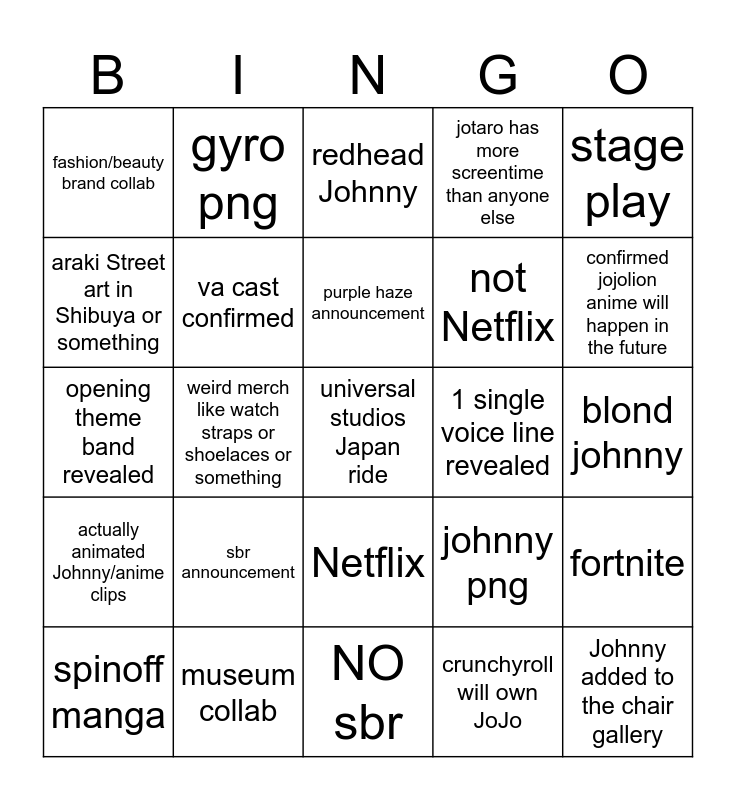 This bingo card has 25 words: sbr announcement, NO sbr, purple haze announcement, spinoff manga, stage play, fashion/beauty brand collab, araki Street art in Shibuya or something, gyro png, 1 single voice line revealed, Netflix, not Netflix, opening theme band revealed, johnny png, fortnite, va cast confirmed, Johnny added to the chair gallery, blond johnny, redhead Johnny, confirmed jojolion anime will happen in the future, weird merch like watch straps or shoelaces or something, universal studios Japan ride, museum collab, actually animated Johnny/anime clips, jotaro has more screentime than anyone else and crunchyroll will own JoJo.