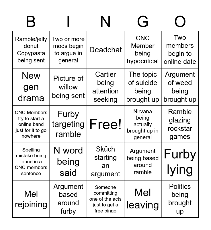 This bingo card has a free space and 24 words: N word being said, Argument based around furby, Cartier being attention seeking, Mel rejoining, Two members begin to online date, Ramble/jelly donut Copypasta being sent, New gen drama, Two or more mods begin to argue in general, Nirvana being actually brought up in general, Sküch starting an argument, The topic of suicide being brought up, CNC Members try to start a online band just for it to go nowhere, Argument being based around ramble, Furby lying, Picture of willow being sent, Mel leaving, Ramble glazing rockstar games, Deadchat, Argument of weed being brought up, Furby targeting ramble, Politics being brought up, Spelling mistake being found in a CNC members sentence, CNC Member being hypocritical and Someone committing one of the acts just to get a free bingo.