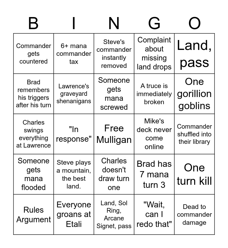 This bingo card has a free space and 24 words: Steve plays a mountain, the best land., Everyone groans at Etali, Someone gets mana screwed, Rules Argument, Land, pass, Commander gets countered, Brad remembers his triggers after his turn, 6+ mana commander tax, Mike's deck never come online, Charles doesn't draw turn one, A truce is immediately broken, Charles swings everything at Lawrence, Brad has 7 mana turn 3, One turn kill, Lawrence's graveyard shenanigans, "Wait, can I redo that", Commander shuffled into their library, Steve's commander instantly removed, One gorillion goblins, "In response", Dead to commander damage, Someone gets mana flooded, Complaint about missing land drops and Land, Sol Ring, Arcane Signet, pass.