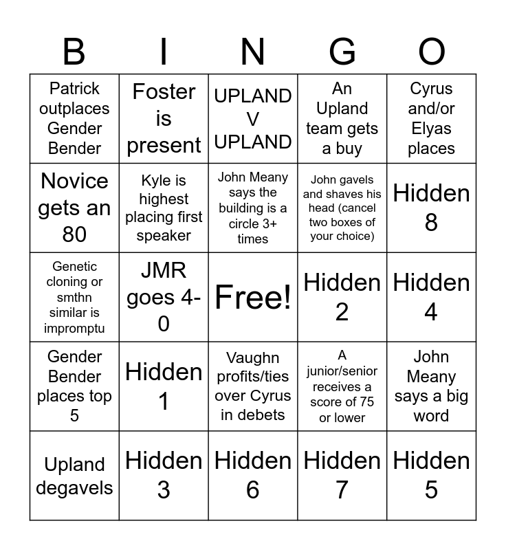 This bingo card has a free space and 29 words: Upland degavels, CLA goes 3-1, JMR goes 4-0, China (LWV) goes 2-2, Patrick outplaces Gender Bender, UPLAND V UPLAND, Kyle is highest placing first speaker, Hidden 1, Hidden 2, Hidden 3, Hidden 4, Hidden 5, Hidden 6, Hidden 7, Hidden 8, Cyrus profits/ties over Vaughn in debets, Vaughn profits/ties over Cyrus in debets, Gender Bender places top 5, Cyrus and/or Elyas places, Genetic cloning or smthn similar is impromptu, A junior/senior receives a score of 75 or lower, Quoting Han, "Somebody has a nastyyyy position while sleeping on the bus", John gavels and shaves his head (cancel two boxes of your choice), Novice gets an 80, An Upland team gets a buy, Foster is present, John Meany says a big word, John Meany says the building is a circle 3+ times and Vaughn, Owen, Matthew, or Dylan do not place.