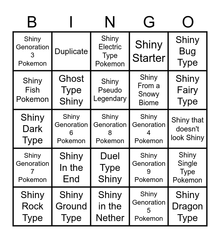 This bingo card has 35 words: Grass Type Shiny, Fire Type Shiny, Water Type Shiny, Ghost Type Shiny, Duel Type Shiny, Shiny Starter, Shiny Fish Pokemon, Shiny Bird Pokemon, Shiny Pseudo Legendary, Shiny From Fishing, Shiny Dark Type, Shiny Bug Type, Shiny Genoration 1 Pokemon, Shiny Genoration 2 Pokemon, Shiny Genoration 3 Pokemon, Shiny Genoration 4 Pokemon, Shiny Genoration 5 Pokemon, Shiny Genoration 6 Pokemon, Shiny Genoration 7 Pokemon, Shiny Genoration 8 Pokemon, Shiny Genoration 9 Pokemon, Shiny Rock Type, Shiny Single Type Pokemon, Shiny Ground Type, Shiny Electric Type Pokemon, Shiny Fairy Type, Shiny Dragon Type, Shiny from a Desert Biome, Shiny From a Snowy Biome, Shiny that doesn't look Shiny, Pink Shiny, Shiny in the Nether, Shiny In the End, Duplicate and Shiny that doesn't evolve.