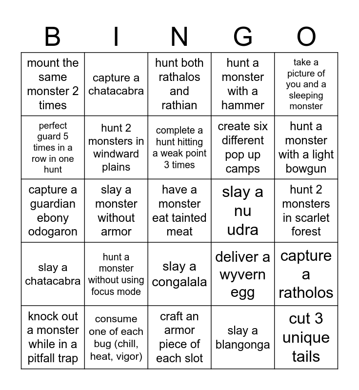 This bingo card has 25 words: hunt a monster without using focus mode, craft an armor piece of each slot, complete a hunt hitting a weak point 3 times, knock out a monster while in a pitfall trap, take a picture of you and a sleeping monster, mount the same monster 2 times, perfect guard 5 times in a row in one hunt, capture a chatacabra, slay a nu udra, slay a congalala, create six different pop up camps, capture a guardian ebony odogaron, deliver a wyvern egg, capture a ratholos, hunt 2 monsters in windward plains, cut 3 unique tails, hunt 2 monsters in scarlet forest, hunt both rathalos and rathian, hunt a monster with a light bowgun, slay a monster without armor, have a monster eat tainted meat, consume one of each bug (chill, heat, vigor), slay a chatacabra, hunt a monster with a hammer and slay a blangonga.