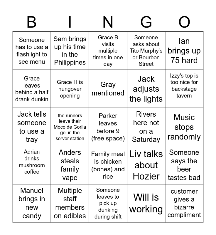 This bingo card has a free space and 34 words: Guests try and come in before opening, Will is working, Zach comes to visit, Adrian and Jack wear matching outfits, Adrian drinks mushroom coffee, Grace H is hungover opening, Ian brings up 75 hard, Manuel brings in new candy, Sam brings up his time in the Philippines, Payton is going to see a show tomorrow, Gray mentioned, Grace B visits multiple times in one day, Ian brings up his Japan trip, The bar is only full of staff, Rivers here not on a Saturday, Izzy's top is too nice for backstage tavern, Multiple staff members on edibles, Jack tells someone to use a tray, Anders steals family vape, Liv talks about Hozier, Family meal is chicken (bones) and rice, Bathrooms break, Someone has to use a flashlight to see menu, Music stops randomly, Someone leaves to pick up dunking during shift, customer gives a bizarre compliment, Someone asks about Tito Murphy's or Bourbon Street, Kyra labels everyone's individual plates for family, Jack adjusts the lights, Grace leaves behind a half drank dunkin, Adam asks when the kitchen closes, the runners leave their Moco de Gorila gel in the server station, Someone says the beer tastes bad and someone orders apple cider.