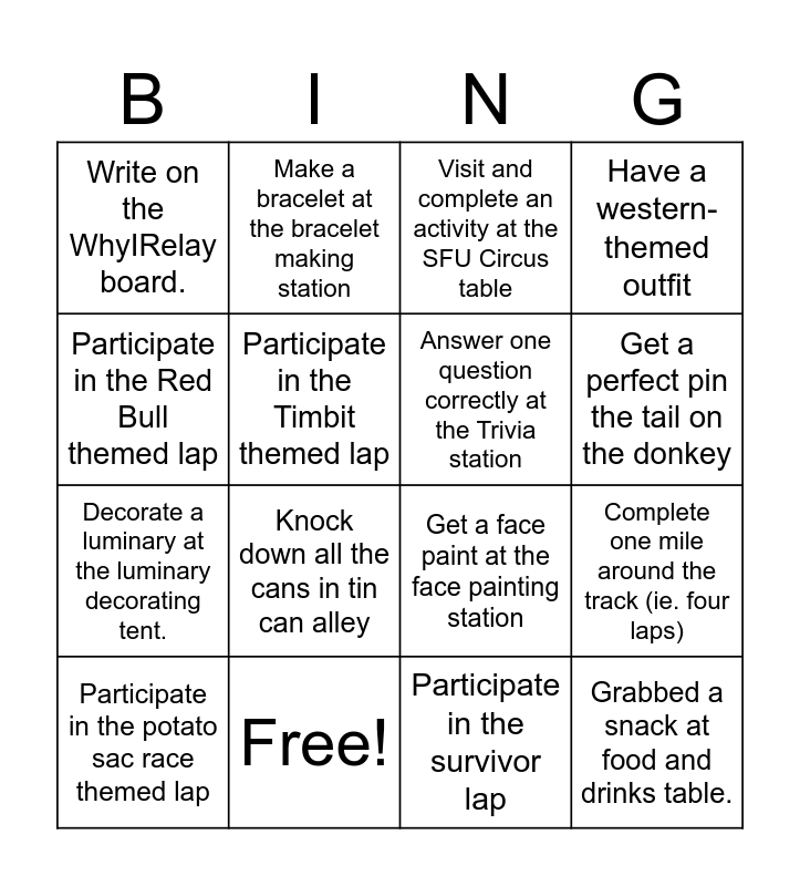 This bingo card has 16 words: Free!, Complete one mile around the track (ie. four laps), Visit and complete an activity at the SFU Circus table, Write on the WhyIRelay board., Decorate a luminary at the luminary decorating tent., Make a bracelet at the bracelet making station, Get a face paint at the face painting station, Participate in the survivor lap, Participate in the Red Bull themed lap, Participate in the Timbit themed lap, Participate in the potato sac race themed lap, Have a western-themed outfit, Knock down all the cans in tin can alley, Get a perfect pin the tail on the donkey, Answer one question correctly at the Trivia station and Grabbed a snack at food and drinks table..